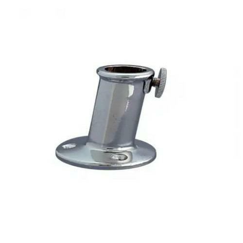 Dit schuine model vlaggenstokhouder is leverbaar in 3 maten. Hij staat onder een lichte hoek op de voetplaat. De vlaggenstokhouder is gemaakt van stevig messing, of naar keuze verchroomd. De borging met de metalen borgschroef voorkomt dat de vlag spontaan in het water ligt.