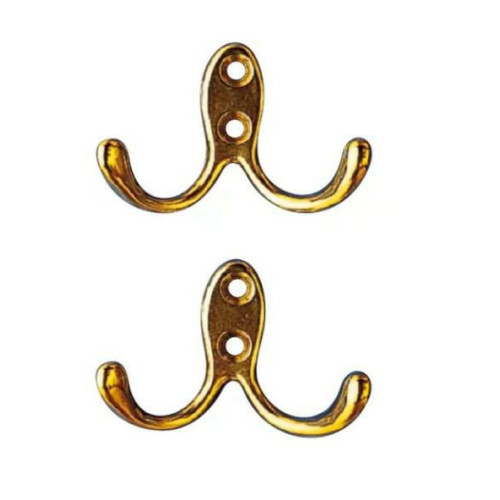 Set van twee messing kledinghaken met elk 2 haakjes. Ook verkrijgbaar in verchroomd messing. Geschikt voor het ophangen van keukendoeken, handdoeken, (zeil)kleding en badjassen.